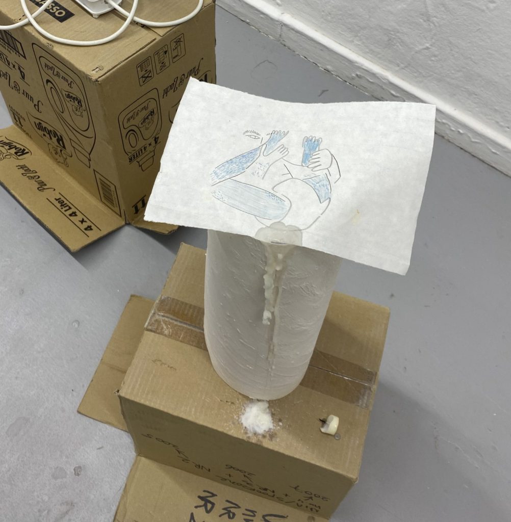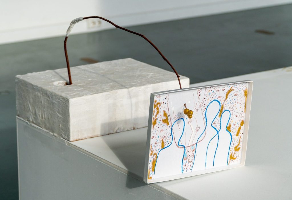 Heavy will Part_1, drawing on shoe box, wood stick, tissue, clay; part_2, drawing, wood stick, power strip Drawing installations SEE LAB, Den Haag, 2024